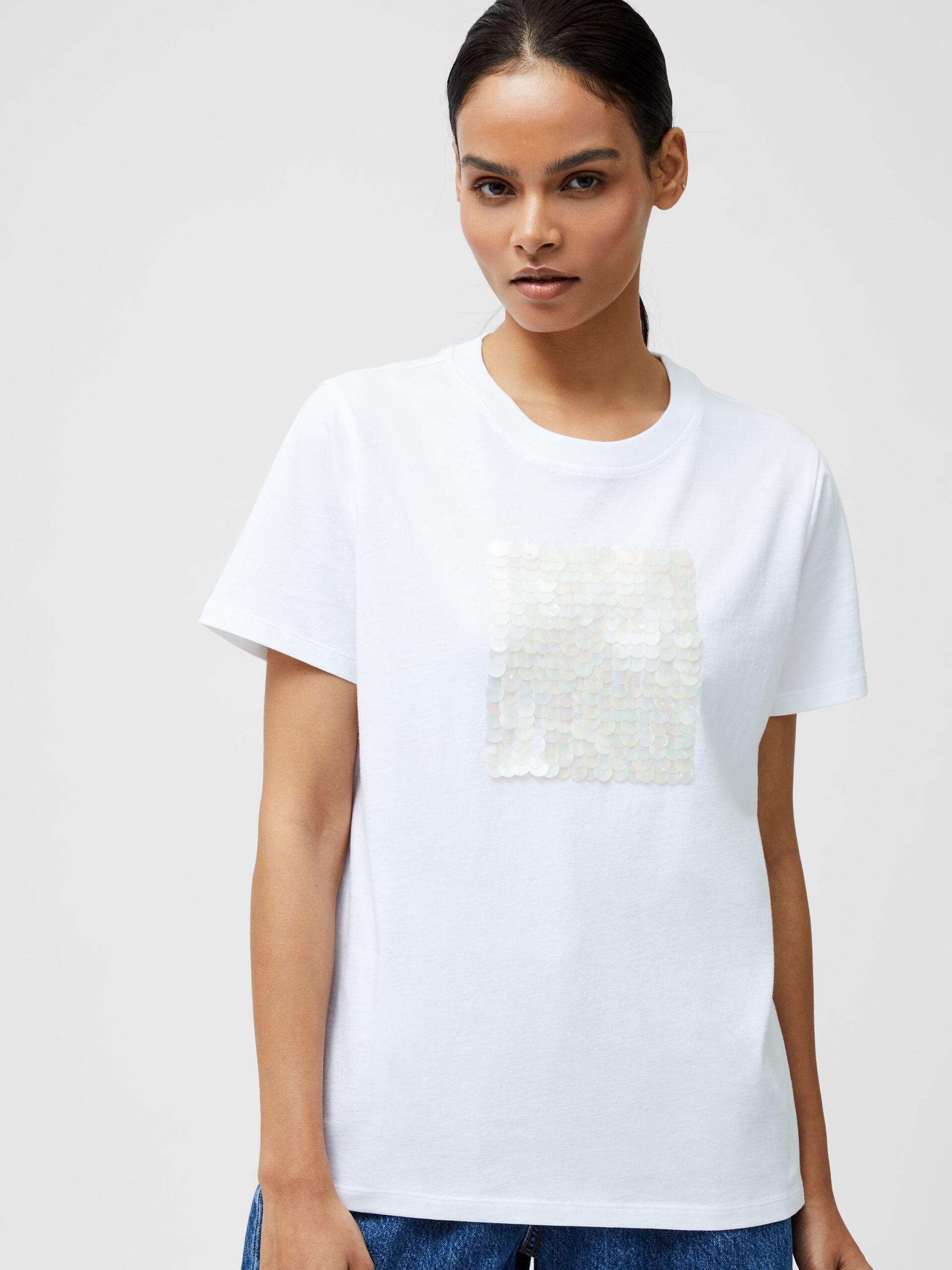 Casual meets captivating with our Sequin Jersey Short Sleeve T-Shirt. This soft short sleeve tee features clear disc sequins in a square shaped formation. T-Shirt Fabric: soft, jersey, white Short sleeves Crew neckline Square design of sequin embellishment Regular fit Size S length is 63cm Our model is 5ft7.5″ and wearing a Size S Style code – 76YAP