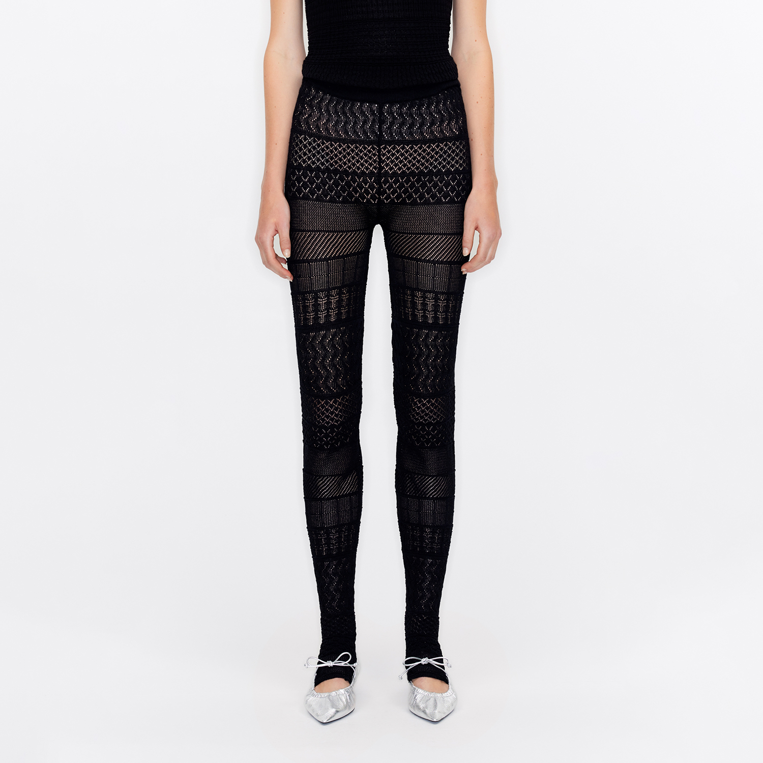 Black cotton blend trousers with various textured patterns. High-waist model with inner elasticated waist.