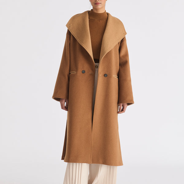 Description:designed with a wide collar and long sleeves, this two-tone oversized coat is crafted from a blend of premium wool and high-quality synthe