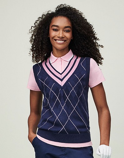 The Crew Clothing Navy Argyle Vest is a sleeveless golf vest that combines both style and functionality. This vest features an iconic argyle pattern in navy, which gives off a classic varsity vibe. The v-neckline and ribbed hems make it a perfect fit for any body type.