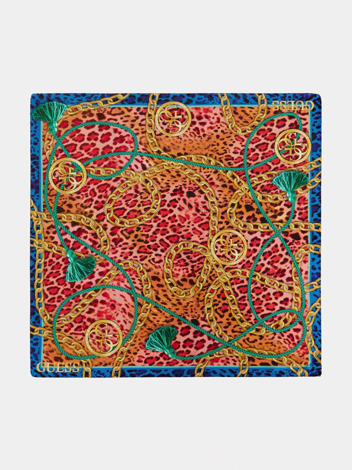 Introducing the luxurious Guess 4G Logo Animalier Neckerchief – a silk blend accessory that exudes sophistication and elegance. This unique piece features an animalier print, adorned with chains and the iconic 4G logo, making it a true statement piece that is sure to turn heads. Measuring at 90×90 cm / 35.4×35.4 in, this neckerchief is not only stylish but versatile, allowing it to be worn in a variety of ways.