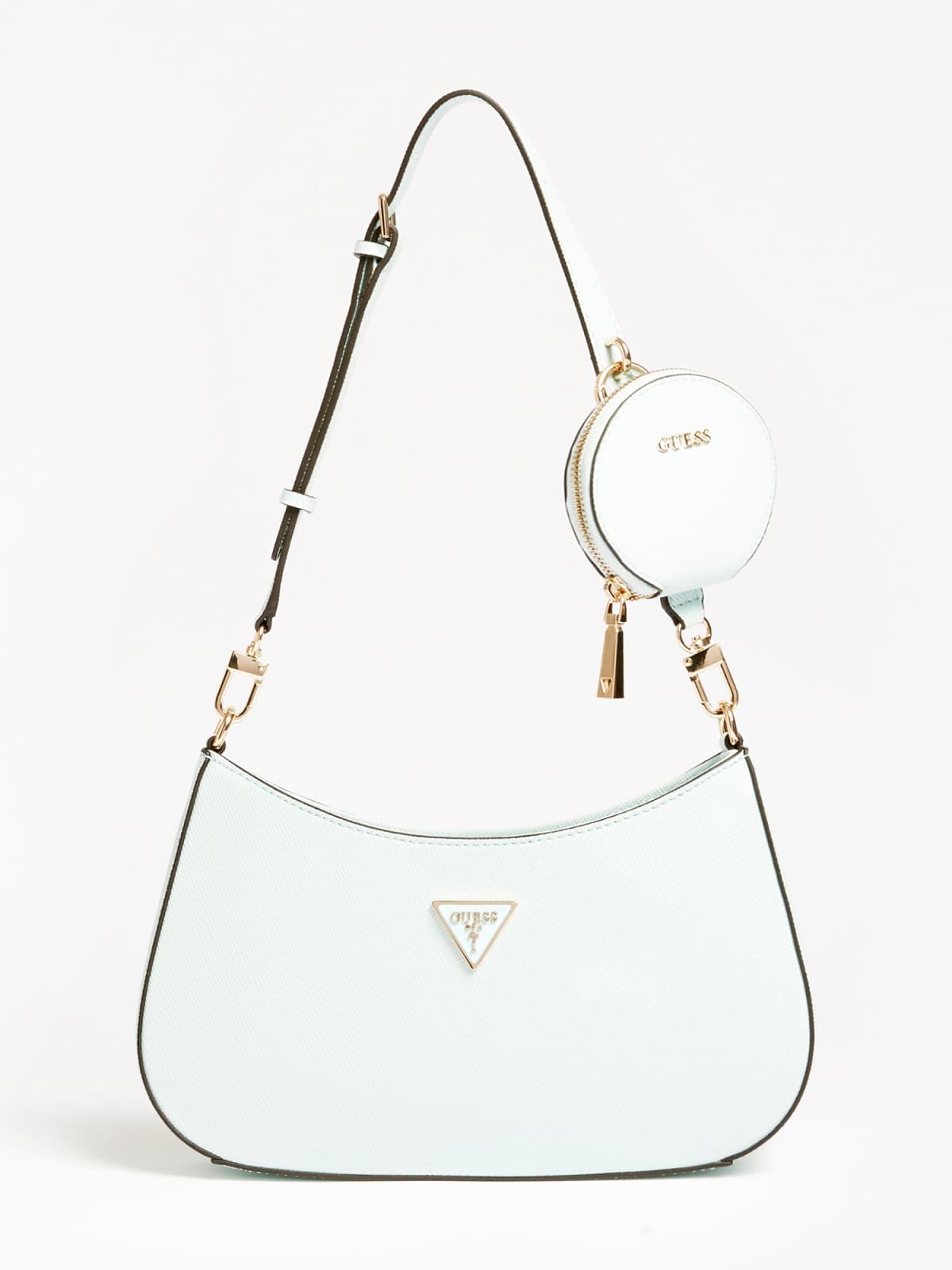 It features a secure zip closure that keeps all your belongings safe and gold hardware that adds a pop of shine. The handle has a logo-detail charm with a zip that adds a stylish element to the bag and provides a handy place to store your keys or phone. The metal triangle logo on the front of the bag is a subtle yet recognizable nod to the Guess brand.