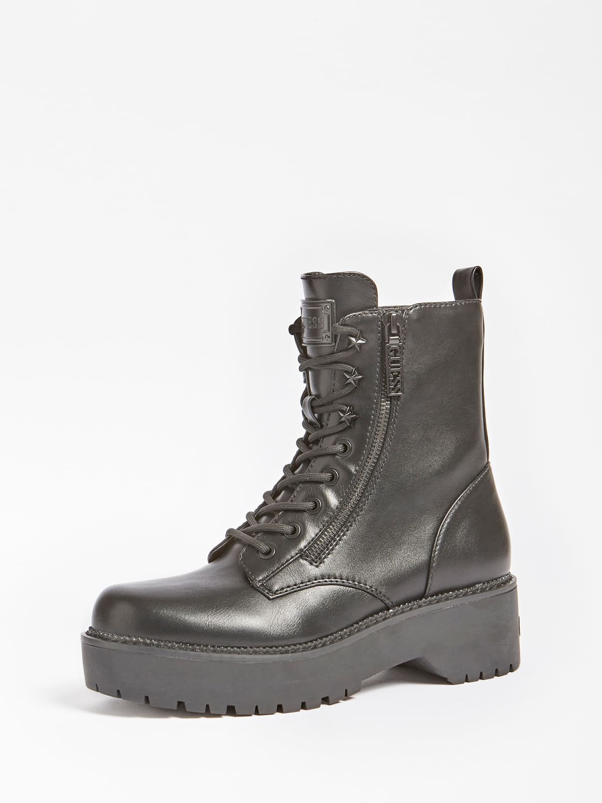 The Guess Tayte Combat Boot is the perfect addition to any outfit. Made from high-quality synthetic materials, these boots will stand up to any wear and tear while still looking great. The round toe and 5 cm heel give the boots a classic combat look, while the star-shaped stud appliqué detailing adds a unique and eye-catching touch.