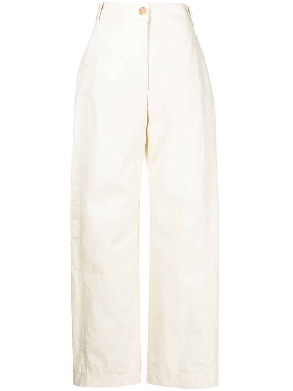 Low Classic high-waist wide-leg trousers high waist button fastening belt loops two side slit pockets two rear flap pockets wide leg Dry Clean Only Designer ID: LOW22SSPT03IV Composition: Cotton 66%, Recycled Nylon 34% Shop all Low Classic Blazer Shop all Low Classic Trousers Shop all Low Classic Shirt Shop all Low Classic Collection